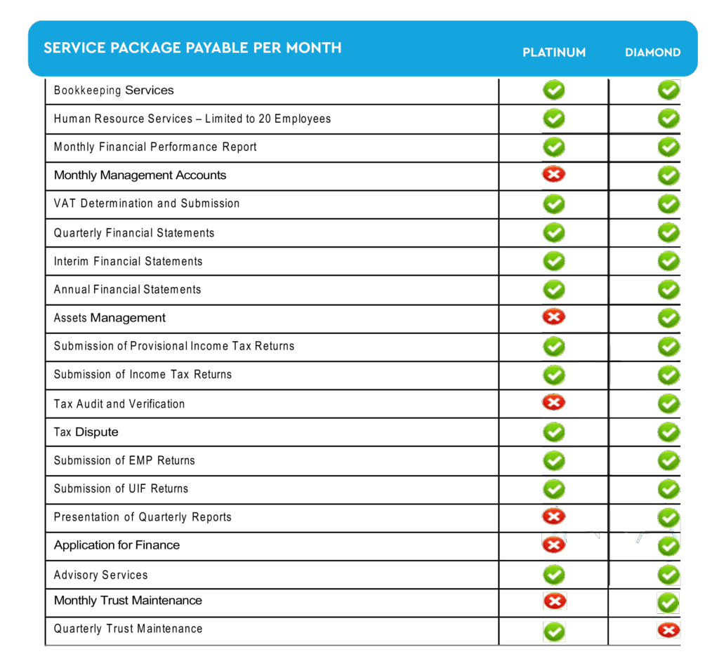 As Mwelase Chartered Accountants we don’t believe that one size fits all still works in this ever-changing economic environment, our approach is to allow our clients to choose service package from dynamic and economical options that we have designed and developed, and which will suit their business needs. Our company believes that tailor made services allow client to look at their business stage, business needs, budget, and risk exposure that their business faces. Below are different services packages that our clients can choose from.
